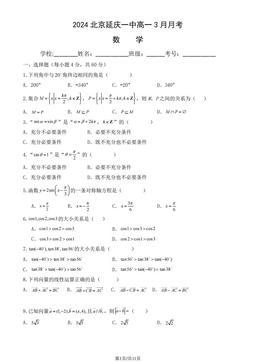 文件名称:2024北京 延庆一中高一3月月考数学(教师版)-答案